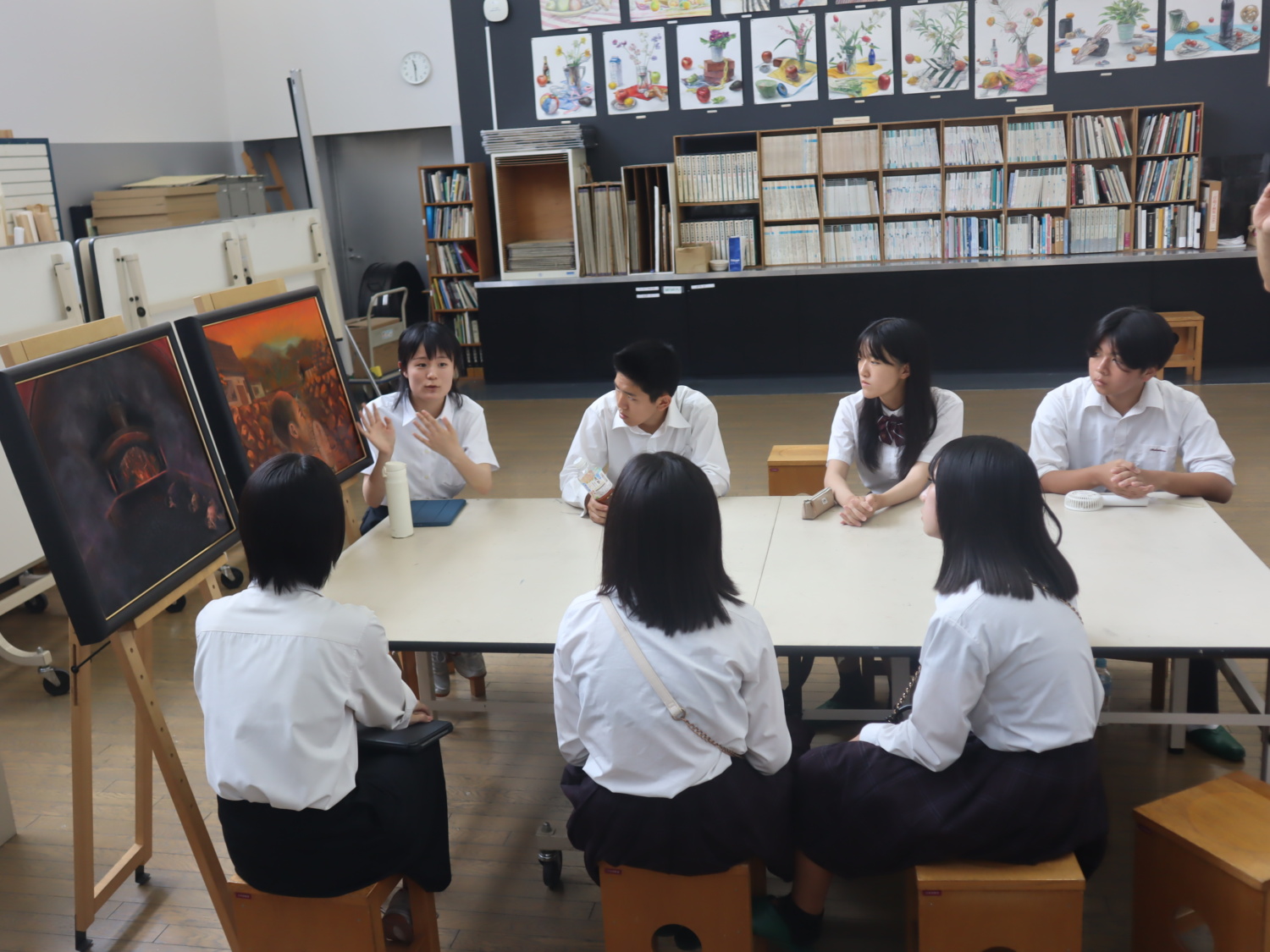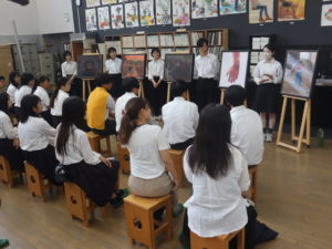 松原高校では「ピースワーク」という平和についての活動が盛んで、基町高校とは2015年から交流があり、今回もその取り組みの一環として来校されました。交流会では、原爆の絵の制作者が各々の作品説明をした後、3つのグループに分かれて絵についての質疑応答をしたり、お互いに「どうしてこの活動に参加しようと思ったのか」などを話し合いました。交流会後にはそれぞれの学校や地元についての話もでき、普段の生活では中々経験することの無い貴重な時間を過ごすことが出来ました。