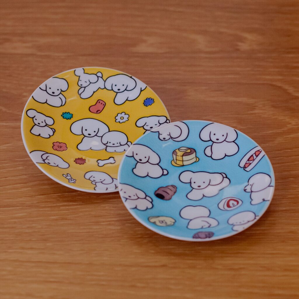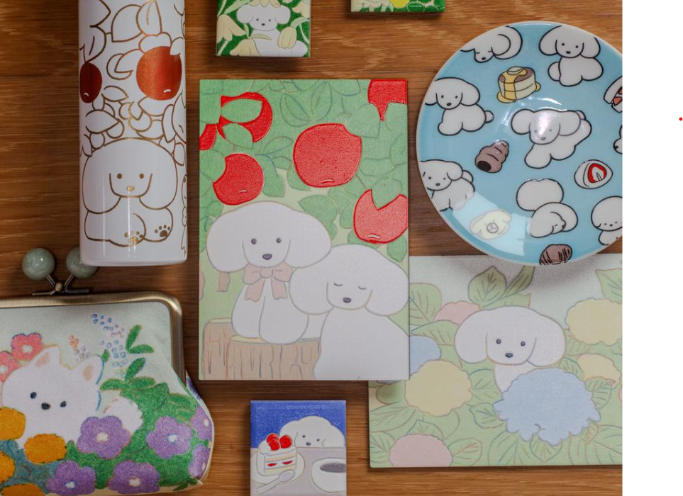作品展では、原画作品(一部店舗)やジークレープリント作品、作品集のほか、マグネットやお皿、ウッドポストカードなど、てらおかなつみさんのオリジナルグッズも販売します。犬を中心とした動物が柔らかなタッチで描かれたイラスト作品と併せて、日々を共に過ごしたくなるグッズをどうぞお楽しみください。