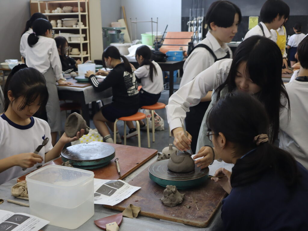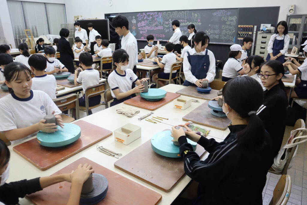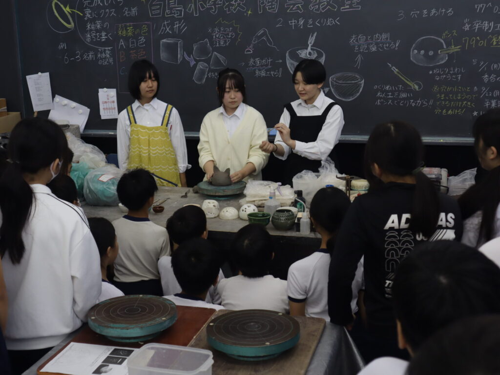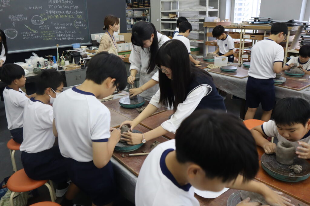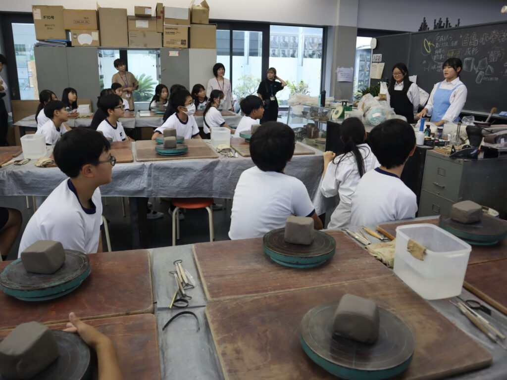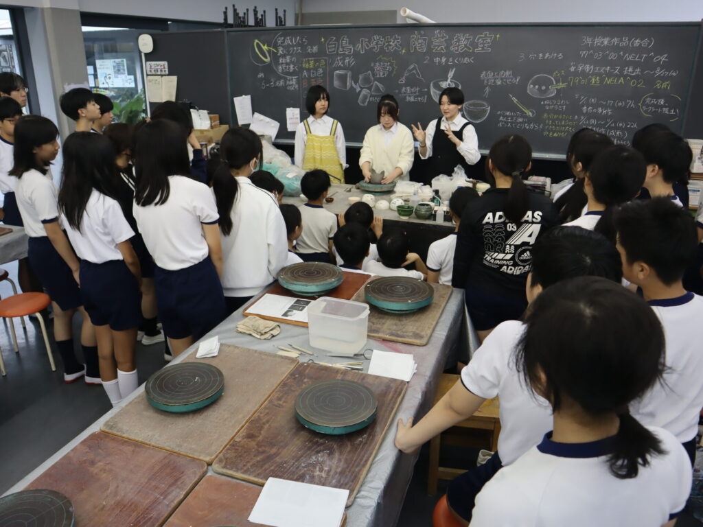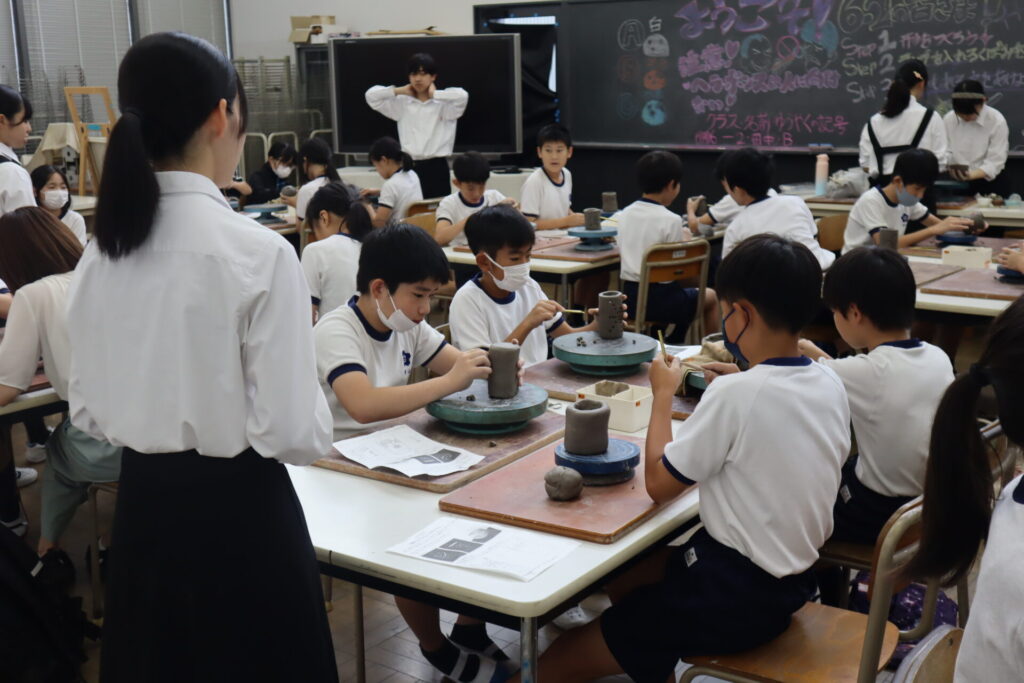 2025年10月3日、白島小学校6年生の児童の皆さんを対象にした陶芸教室を行いました。この行事は、創造表現コースの生徒が子どもたちに対して美術の制作についての指導を経験をするため、毎年行っている行事です。今回は創造表現コース1年生が指導スタッフとして参加し、中にキャンドルやライトなどを入れて楽しむ「ランンプシェード」の制作を指導し、作品制作のサポートをしました。