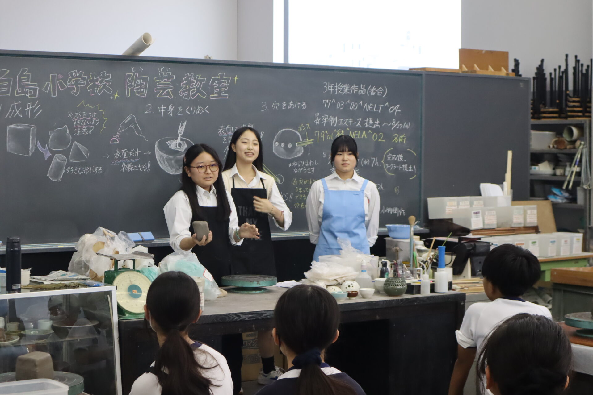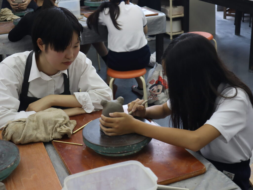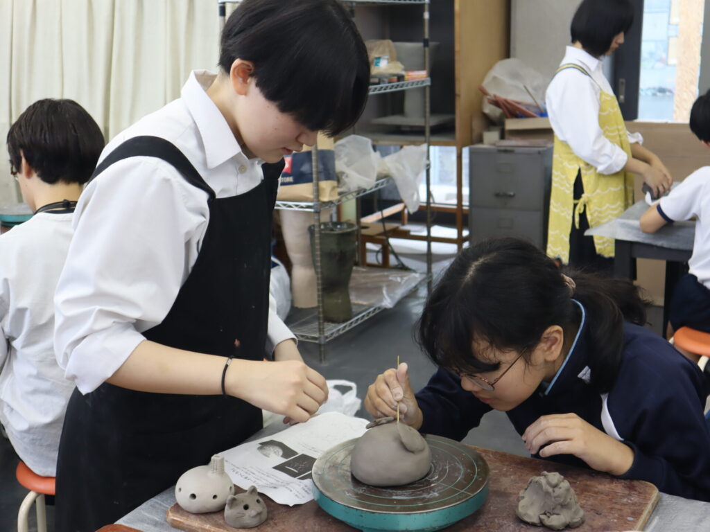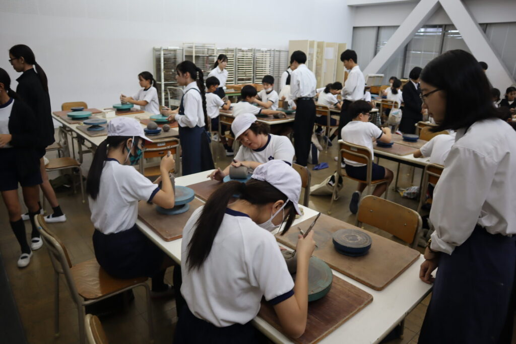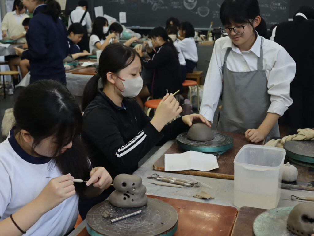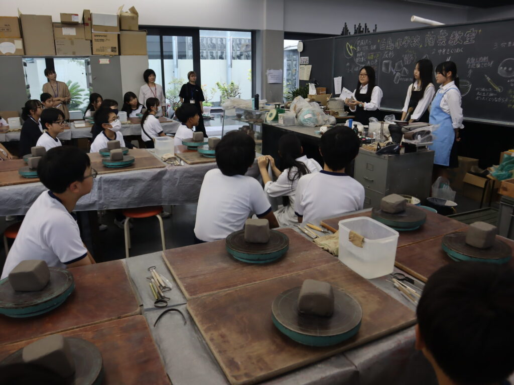 2025年10月3日、白島小学校6年生の児童の皆さんを対象にした陶芸教室を行いました。この行事は、創造表現コースの生徒が子どもたちに対して美術の制作についての指導を経験をするため、毎年行っている行事です。今回は創造表現コース1年生が指導スタッフとして参加し、中にキャンドルやライトなどを入れて楽しむ「ランンプシェード」の制作を指導し、作品制作のサポートをしました。