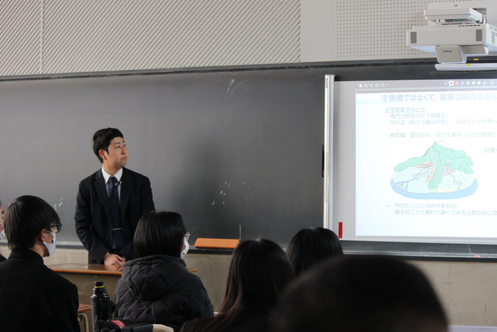 職業探求セミナーでは、「大学で修得する知識・技術等を社会でどのように活かすことができるのか」、「企業や官公庁の各種団体が地域においてどのような役割を果たしているのか」などについて学び、志望する進路に関する視野を広げ、解像度をあげることを目的としています。総合的な探究の時間の取り組みの一環として実施しています。
