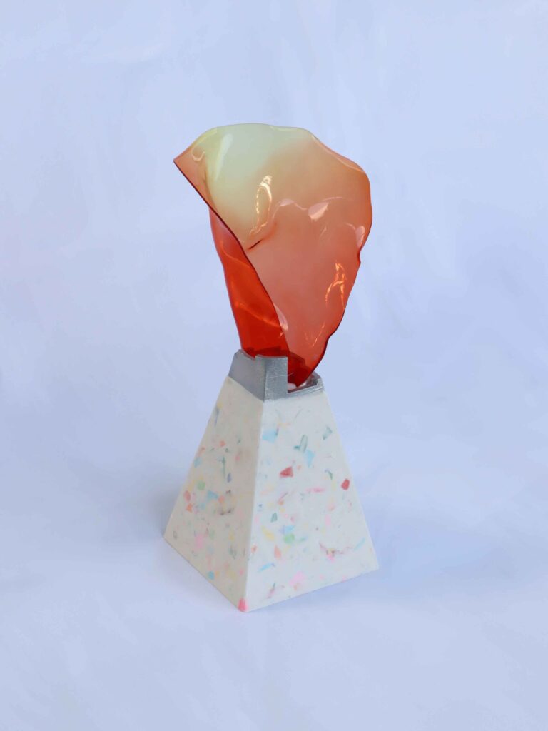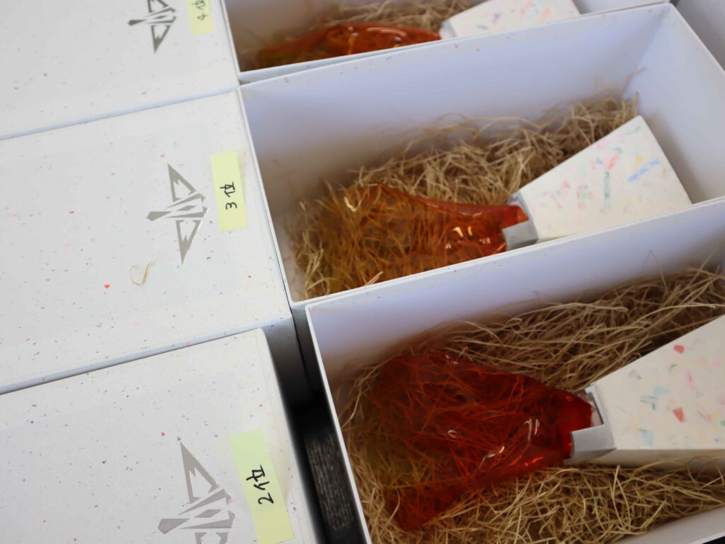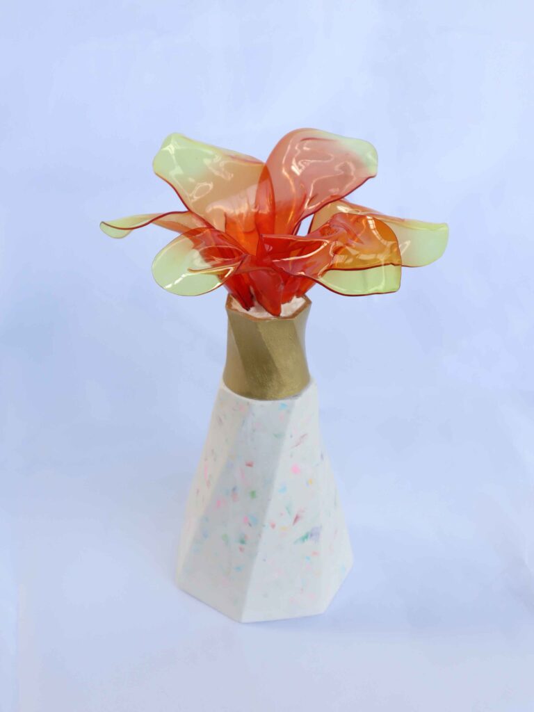 花の鮮やかな赤やオレンジ色が美しいグラデーションになるようにアクリル板を染色したり、熱して花びらの形に見えるように造形したりすることで表現しました。