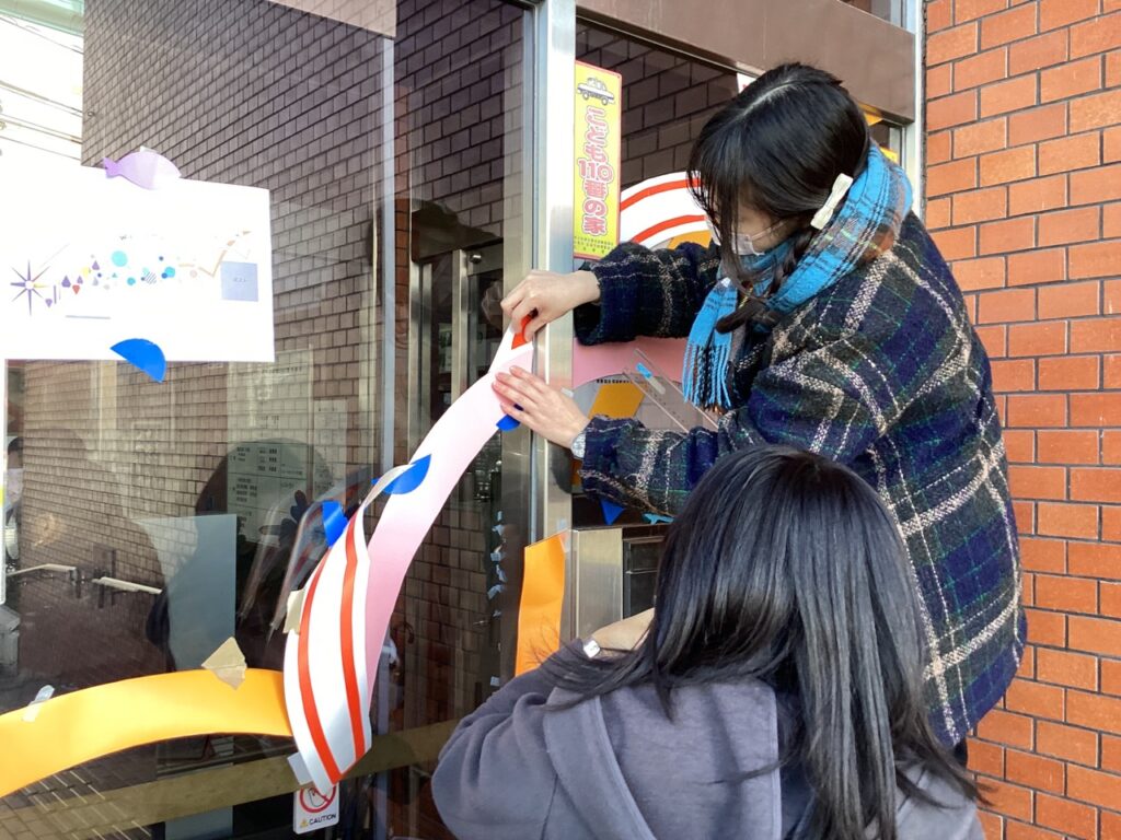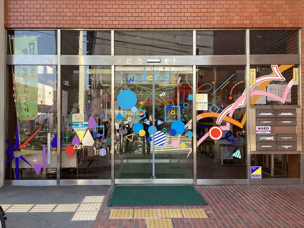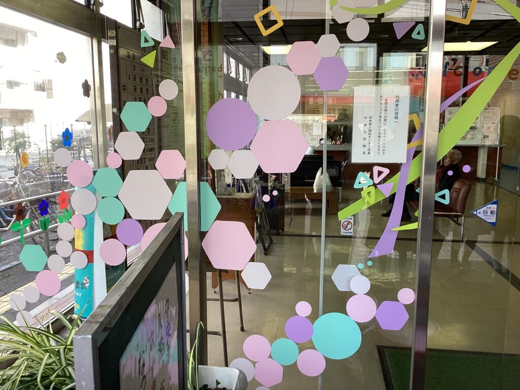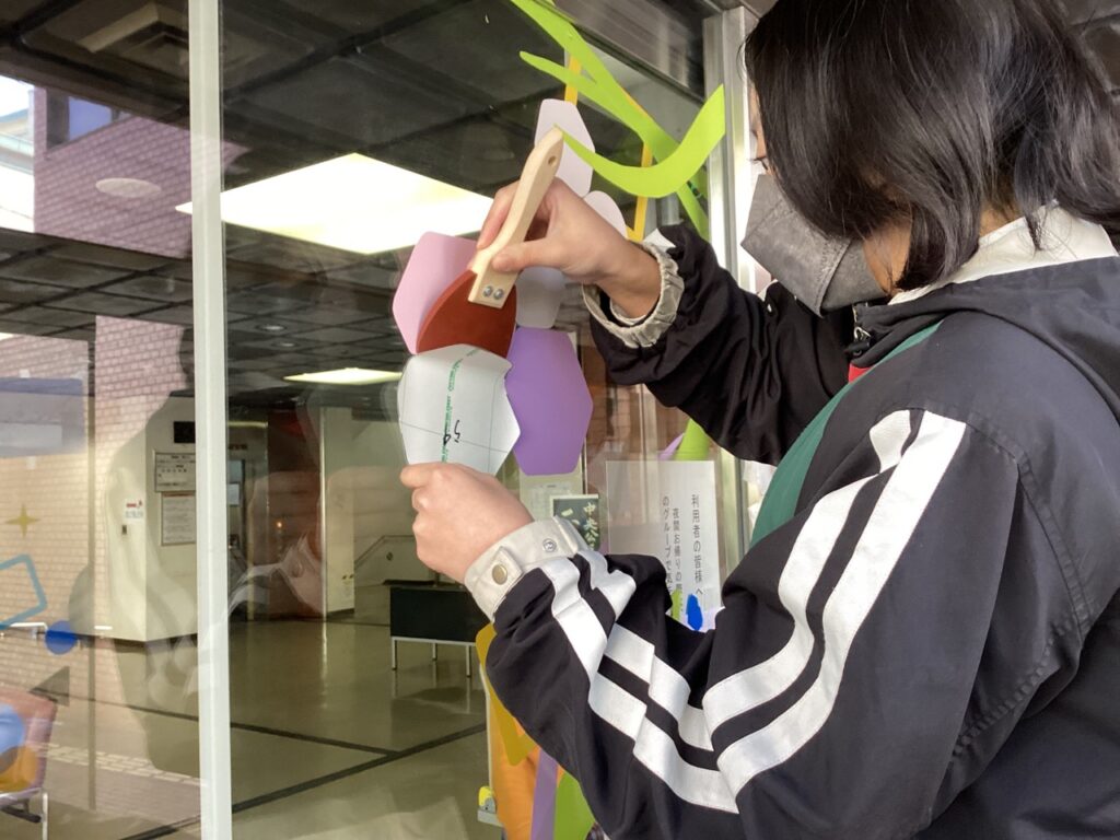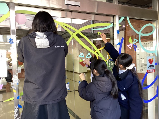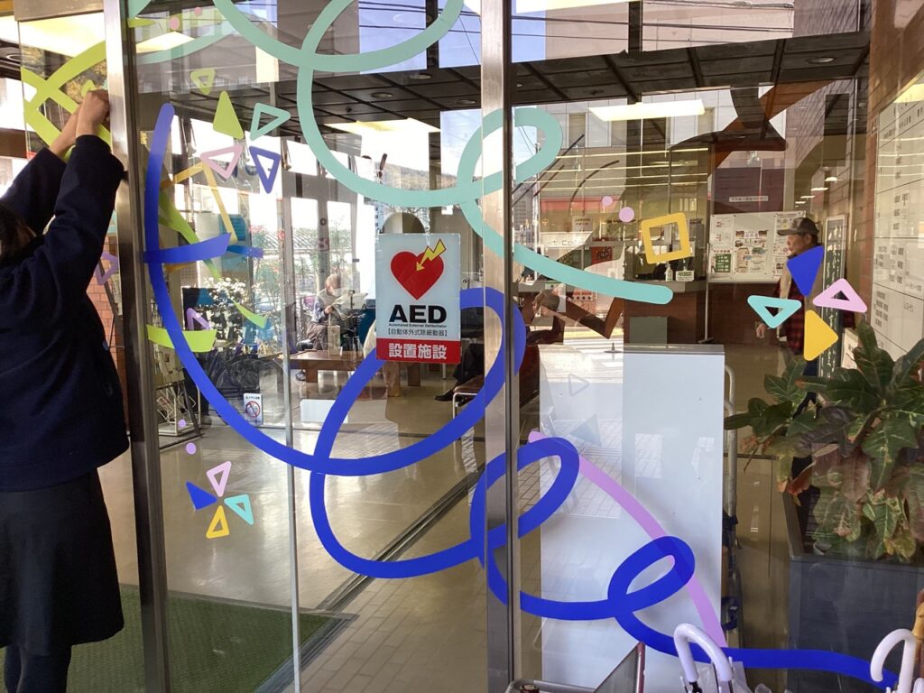 今年のデザインは特にパーツが多かったので、カッティングシートの準備や、実際にガラス面に貼る作業がとても大変でした。しかし、作業中に公民館を利用される方から何度か声をかけていただき、直接感想を伺ったり、喜ばれている様子を見ることができて嬉しかったです。