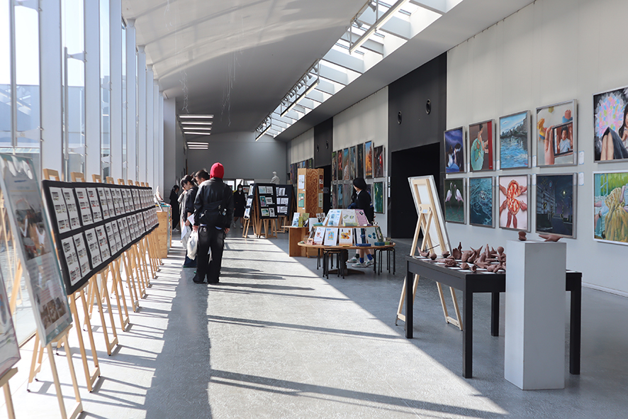 修了作品展は、基町高校創造表現コースや美術部の1・2年生が授業や部活動で制作した作品を、この1年間の締めくくりとして展示するものです。また、外部プロジェクトで制作したポスターやトロフィーなどの作品も同時にお披露目しました。
