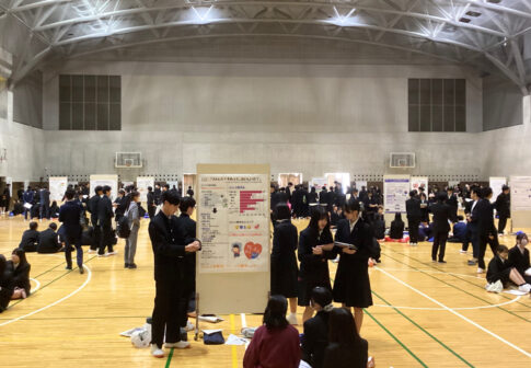 総合的な探究の時間では、進路研究セミナーや修学旅行での進路別研修で学習した内容を踏まえて、各グループで取り組んだ探究の成果について発表する機会としてポスターセッションを行います。